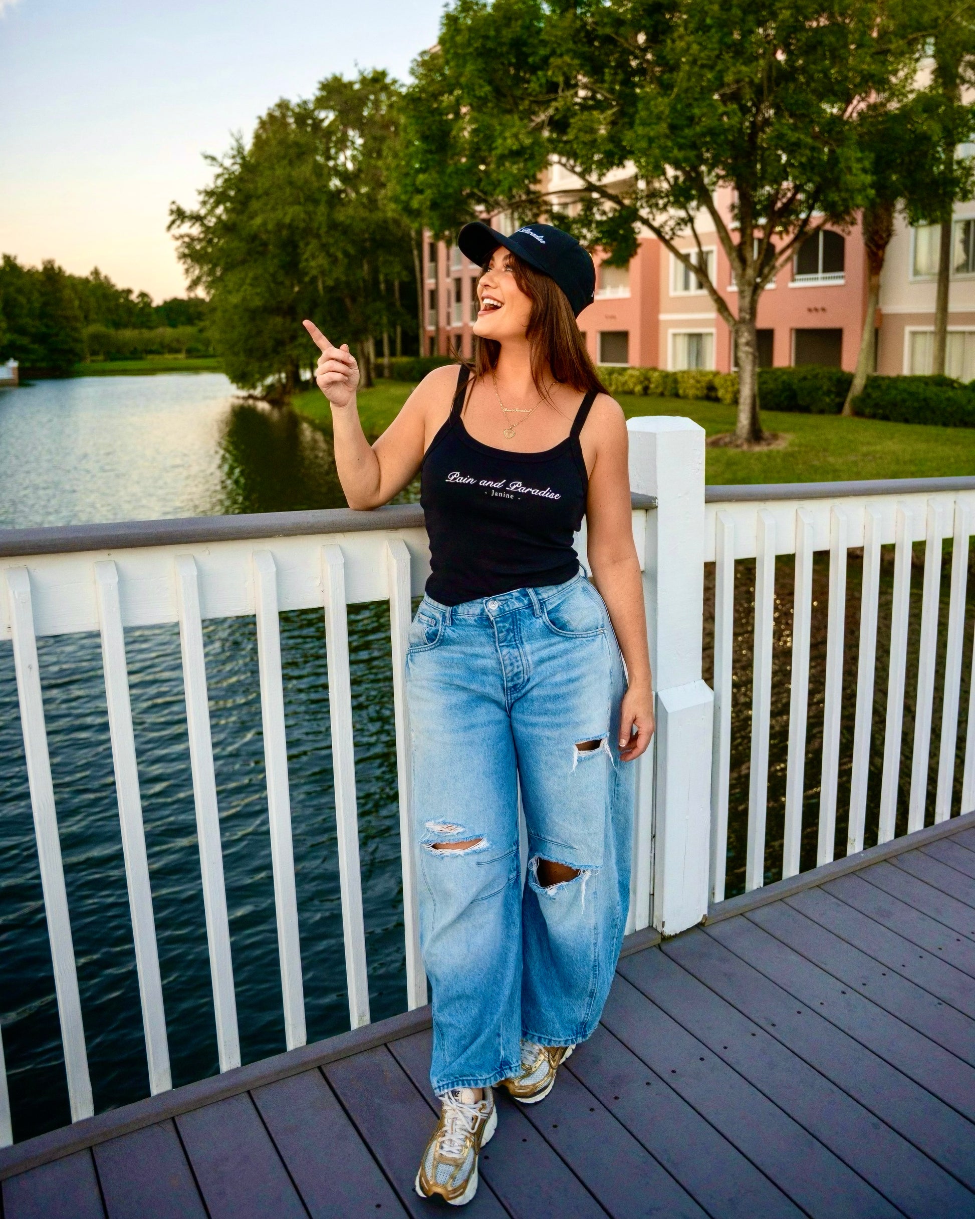 Pain and Paradise album title printed on black women's tank top.